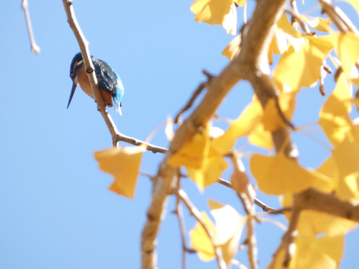 〔文庫の周りにある宝〕晩秋2回目はイチョウにカワセミ。この強烈に映える色合いは補色。美術の授業で習いました。周りの木々の葉も少なくなってきて、原色が目に飛び込んでくる文庫周辺です。